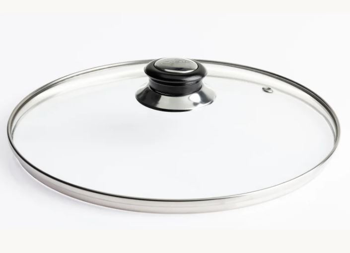 Apukokin lasikansi. Halkaisija 26 cm. Kannessa höyryaukko. Konepesun kestävä.